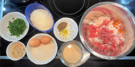 Alle restlichen Zutaten hinzufügen und kleine Bälle formen. Im Anschluss etwas flach drücken.