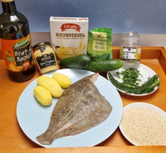 Bringe die Kartoffeln zum kochen, paniere die Scholle in Reismehl (für den nussigen Geschmack habe ich dem Mehl etwas Sesam zugefügt). Evtl. den Fisch vorher mit einem Eigelb bestreichen, dann in das Mehl legen.