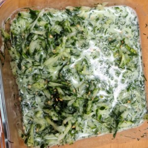Zuerst stelle ich alle Zutaten zusammen, schäle Kartoffeln, reibe die Gurken und schneide die Kräuter (Schnittlauch, Dill, Estragon). Füge dann die Kräuter dem Gurkensalat zu und auch dem Senf.