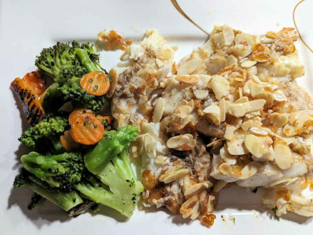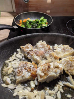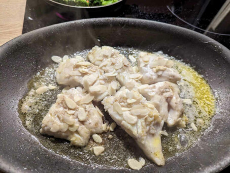 Nach 10 Minuten wenden und wieder Mandelsplitter dazu geben.